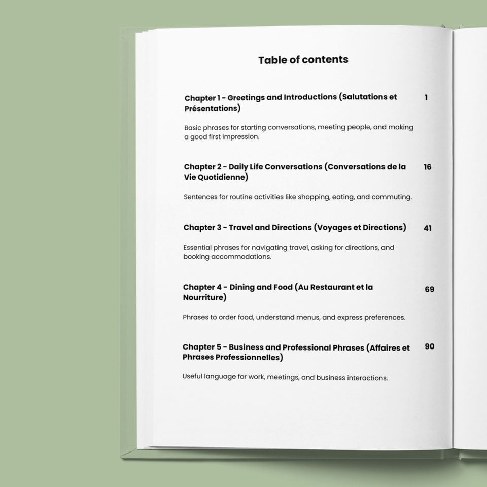 This book is packed with practical phrases for real-life situations—from greetings and daily conversations to travel, business, and emergencies. You’ll also dive into cultural expressions, idioms, and professional language to sound more natural and confident in French-speaking environments.
